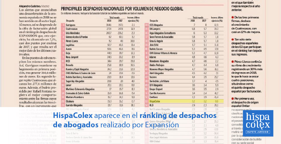 Cada año, el periódico económico Expansión hace público el ránking de despachos de abogados en el que incluye a las firmas legales de España con mayor peso en el sector. Y este año, a pesar de ser el segundo año consecutivo en el que el sector ralentiza su crecimiento, HispaColex Bufete Jurídico ha conseguido colarse en este notorio listado legal que sirve como referente del estado en el que se encuentran los despachos a nivel nacional e internacional.
