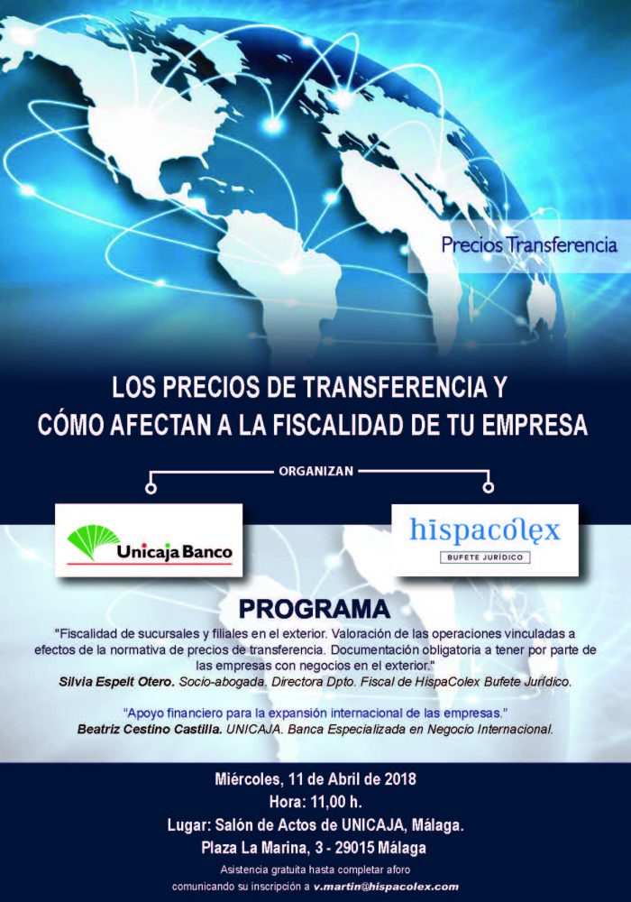 Con el fin de informar sobre la nueva normativa de Precios de Transferencia en España tras la última reforma fiscal, se ha organizado una Jornada por parte de HispaColex Bufete Jurídico y Unicaja, en cuya sede se celebró el pasado 11 de abril.