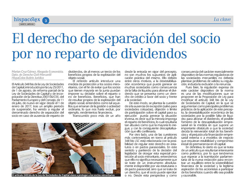 El Artículo 348 bis de la Ley de Sociedades de Capital, introducido por la Ley 25/2011, de 1 de agosto, de reforma parcial de la Ley de Sociedades de Capital y de incorporación de la Directiva 2007/36/CEE, del Parlamento Europeo y del Consejo, de 11 de julio, de nuevo en vigor desde el 1 de enero de 2017, tras un amplio periodo de suspensión, ha venido a regular el denominado derecho de separación del socio en caso de ausencia de reparto de dividendos, de al menos un tercio de los beneficios propios de la explotación del objeto social.