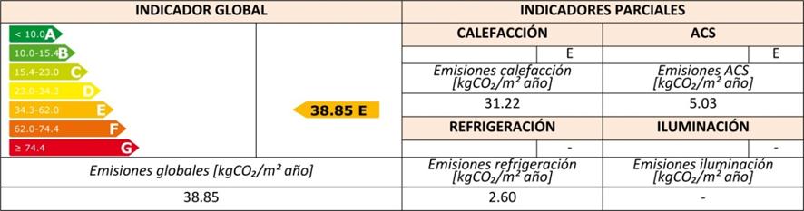 Aquí podemos ver el cuadro indicador de la calificación energética, donde además de la calificación global, podemos ver calificaciones parciales en cuanto a parámetros tales como la calefacción, refrigeración, etc.