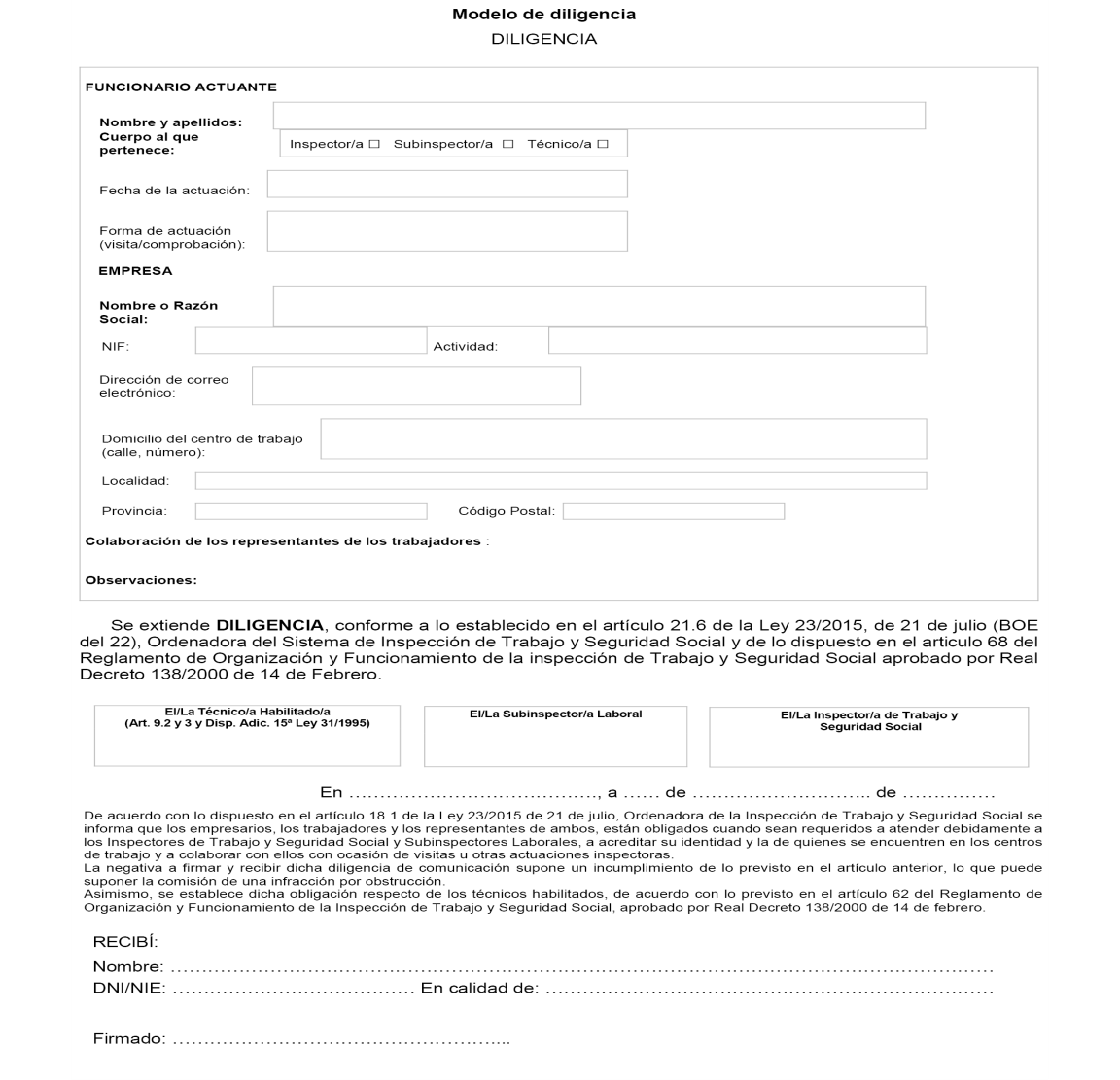 El Artículo 3, bajo la rúbrica de “Modelo de Diligencia”, establece que el modelo a seguir es el que se adjunta como Anexo en la misma orden, sin perjuicio de la utilización de medios electrónicos para su elaboración, regula también el número de copias que se deben expedir (3 copias) una para la empresa, otra para los Delegados de Prevención cuando proceda conforme normativa PRL y otra que quedará en poder el funcionario actuante para su archivo, y para dar cumplimiento a lo preceptuado en los Artículos 2 y 3 de nuestra Carta Magna, regula que el modelo de diligencia se confeccionará en versión bilingüe en la CCAA con lengua cooficial.