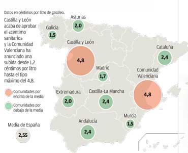 El “céntimo sanitario”, cuya aplicación ha sido considerada contraria a la normativa comunitaria por el TJUE, ha estado implantado en 13 comunidades autónomas hasta enero de 2013 y osciló entre 1,2 y 4,8 céntimos por litro de carburante en trece comunidades autónomas, que fueron Andalucía, Extremadura, Murcia, Cantabria, Castilla y León, Castilla-La Mancha, Valencia, Baleares, Navarra, Madrid, Asturias, Galicia y Cataluña.