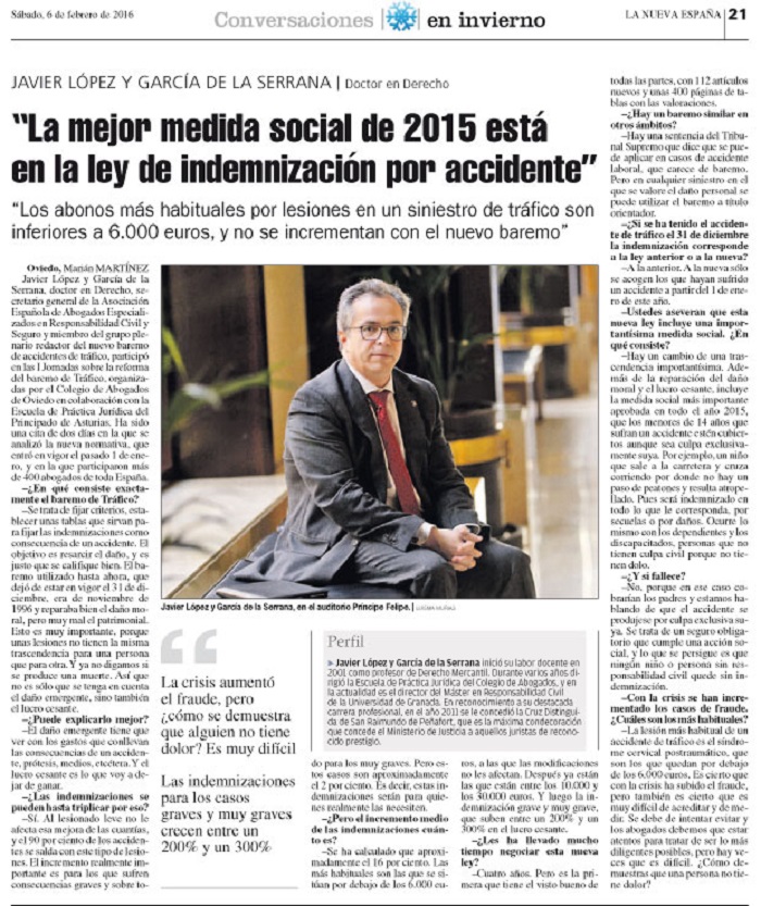 Entrevista del diario Nueva España al director de HispaColex, Javier López y García de la Serrana, sobre el nuevo Baremo de indemnización por accidente