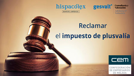 El próximo miércoles 21 de noviembre, a las 9,30 horas, tendrá lugar un seminario organizado conjuntamente por HispaColex Bufete Jurídico y la sociedad de tasación Gesvalt, en colaboración con la Confederación de Empresarios de Málaga (CEM) que bajo el título de «Cómo recuperar la Plusvalía Municipal indebidamente pagada y claves de la Valoración Pericial» estará dirigido a empresas promotoras, constructoras y a todas aquellas empresas interesadas en la recuperación de ingresos indebidos pagados por este impuesto municipal.