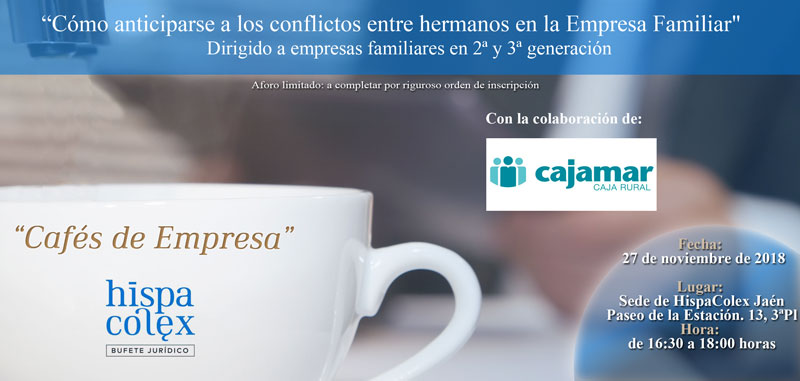 El próximo martes, 27 de noviembre, celebraremos una nueva edición de nuestros “Cafés de Empresa” que, en esta ocasión cuenta con la colaboración de la entidad financiera CAJAMAR y que tiene por objeto abordar diferentes estrategias para anticiparse y evitar posibles conflictos entre hermanos que estén al frente de empresas familiares de Jaén.
