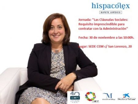 El próximo jueves, 30 de noviembre, de 10:00h a 12:00h, tendrá lugar en la Sede de la Confederación de Empresarios de Málaga (CEM. Calle San Lorenzo, 20 de Málaga) un Coloquio-Café dedicado a «Las cláusulas sociales» cuya ponente será Vanessa Fernández Ferré, Socio-Abogada y Directora del Departamento de Derecho Administrativo de HispaColex Bufete Jurídico quien abordará, entre otros aspectos: