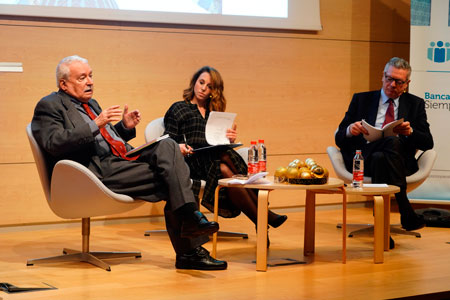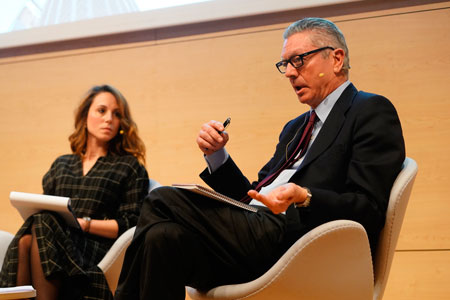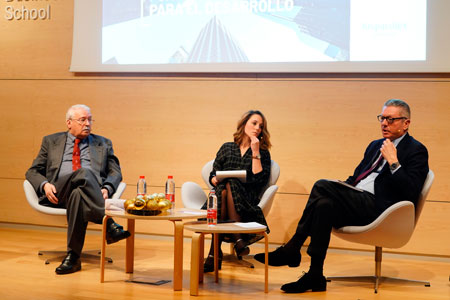 Alberto Ruiz-Gallardón defiende que el tejido empresarial debe luchar para que el Corredor del Mediterráneo pase por Granada y Joaquín Leguina aboga por la necesaria reindustrialización de nuestro país, durante sus respectivas intervenciones en el debate que mantuvieron ayer, patrocinado por HispaColex Bufete Jurídico, Cajamar y Crédito y Caución, en la Escuela Internacional de Gerencia de Granada.