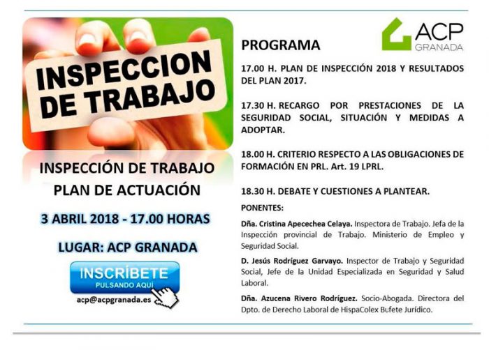 El pasado 3 de Abril en la sede de la Asociación de Promotores y Constructores de Granada (ACP), tuvo lugar una Jornada dedicada a la Inspección de Trabajo en la que también se trataron en profundidad el Recargo por prestaciones de la Seguridad Social y las obligaciones de formación recogidas en el artículo 19 de la Ley de PRL.