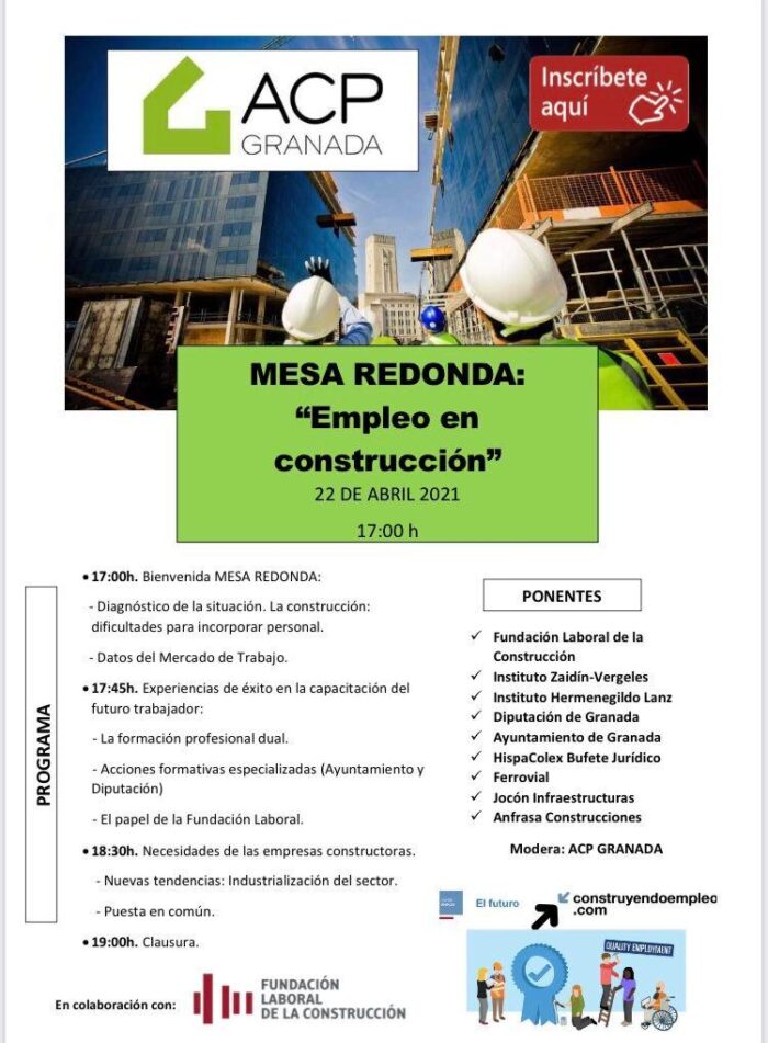 Para participar en la mesa redonda que bajo el título “Empleo en Construcción”, desde ACP Granada habilitan en su página web el siguiente enlace: INSCRIPCIÓN.