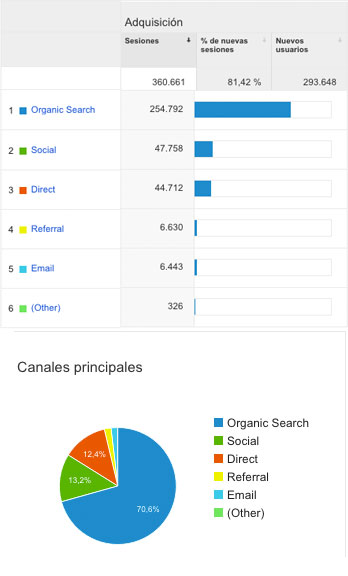 De este total de visitas generadas durante todo el año hay que destacar que el 70,6% (254.792 visitas) proceden de las búsquedas en Google, el 13,2% de las visitas (47.758 visitas) corresponden a las redes sociales, el 12,4% (44.712 visitas) provienen de los usuarios que nos han visitado escribiendo en Google nuestra dirección web y el 1,8% (6.443 visitas) pertenecen a nuestro Boletín Electrónico.