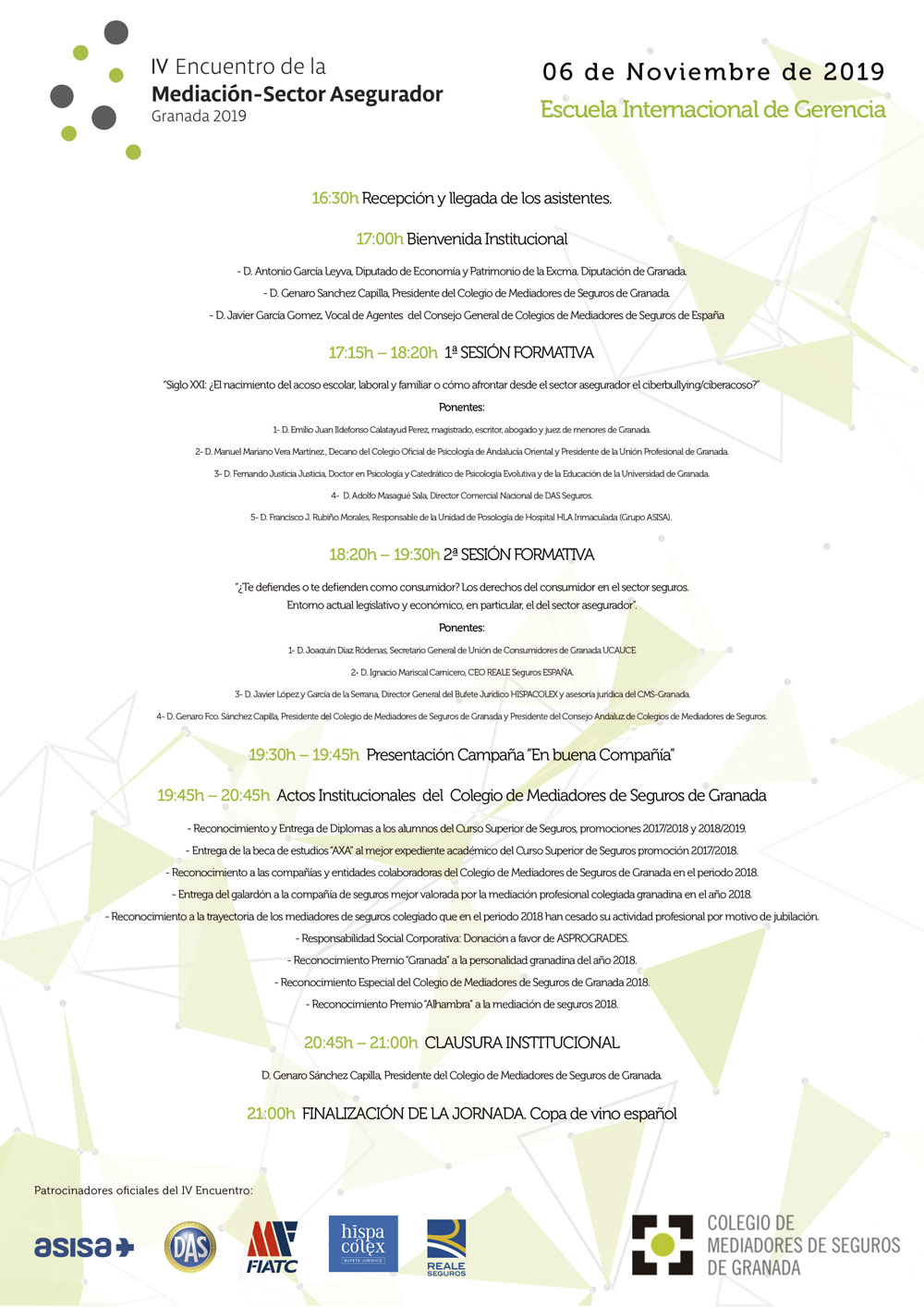 Esta cuarta edición del encuentro anual del sector de la mediación de seguros de Granada ha contado con diferentes sesiones formativas sobre temáticas de máxima actualidad y con la celebración de los actos institucionales propios del Colegio: entrega de diplomas a alumnos de la última promoción, reconocimientos, distinciones y premios a personalidades y empresas afines al sector.