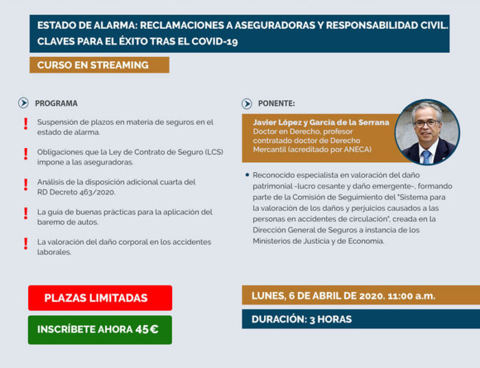 La situación actual de emergencia ha impactado de lleno en el ámbito de los seguro. El éxito en las reclamaciones ahora requiere de nuevas habilidades y conocimientos jurídicos. Para ello, Economist & Jurist School ha logrado contar con uno de los mayores expertos en responsabilidad civil y seguros en España: Javier López y García de la Serrana.