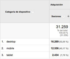 En la tabla de abajo se muestran de que países proceden los usuarios que visitan nuestra web, viendo que de las 31.259 sesiones totales 29.097 proceden de España. Un buen dato, ya que, es nuestro principal mercado objetivo.