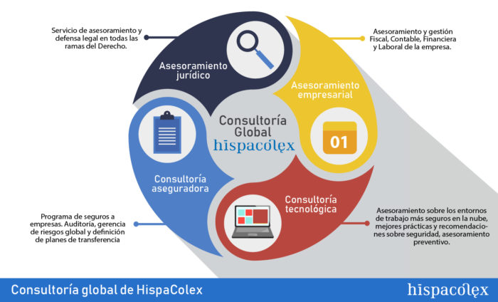 Al igual que las grandes firmas de consultoría legal, conocidas de forma generalizada como las ‘Big Four’ (Deloitte, PwC, Ernst & Young y KPMG), los clientes de HispaColex podrán beneficiarse de contar con un asesoramiento verdaderamente global, en el que todos los estamentos de sus empresas puedan sentirse respaldados. Ya no solo contarán con un equipo de abogados y economistas especializados en cada una de las áreas del derecho y la economía que afectan a su empresa, sino que también, dispondrán de consultores de máxima confianza y profesionalidad que guiarán los pasos de su actividad de forma segura, a través de auditorías de riesgos, productividad e innovación tecnológica. En definitiva, lograr desarrollar su actividad con la tranquilidad de contar con un respaldo legal, asegurador y tecnológico.