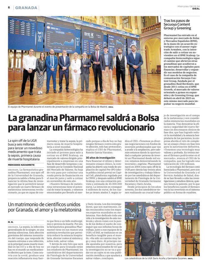El pasado 24 de abril, en el salón de actos Antonio Maura del Palacio de la Bolsa de Madrid, Pharmamel realizó la presentación de su nueva campaña de ampliación de capital Pre-IPO go to BME Scaleup en la plataforma de crowdfunding biotecnológico regulada por la CNMV, Capital Cell, , que tuvo una gran acogida por parte de los numerosos inversores biotecnológicos, fondos de inversión, así como profesionales de la salud y la industria farmacéutica que asistieron al evento y que augura el éxito para la obtención de los recursos necesarios para la comercialización de este revolucionario fármaco tras la salida a cotización bursátil.