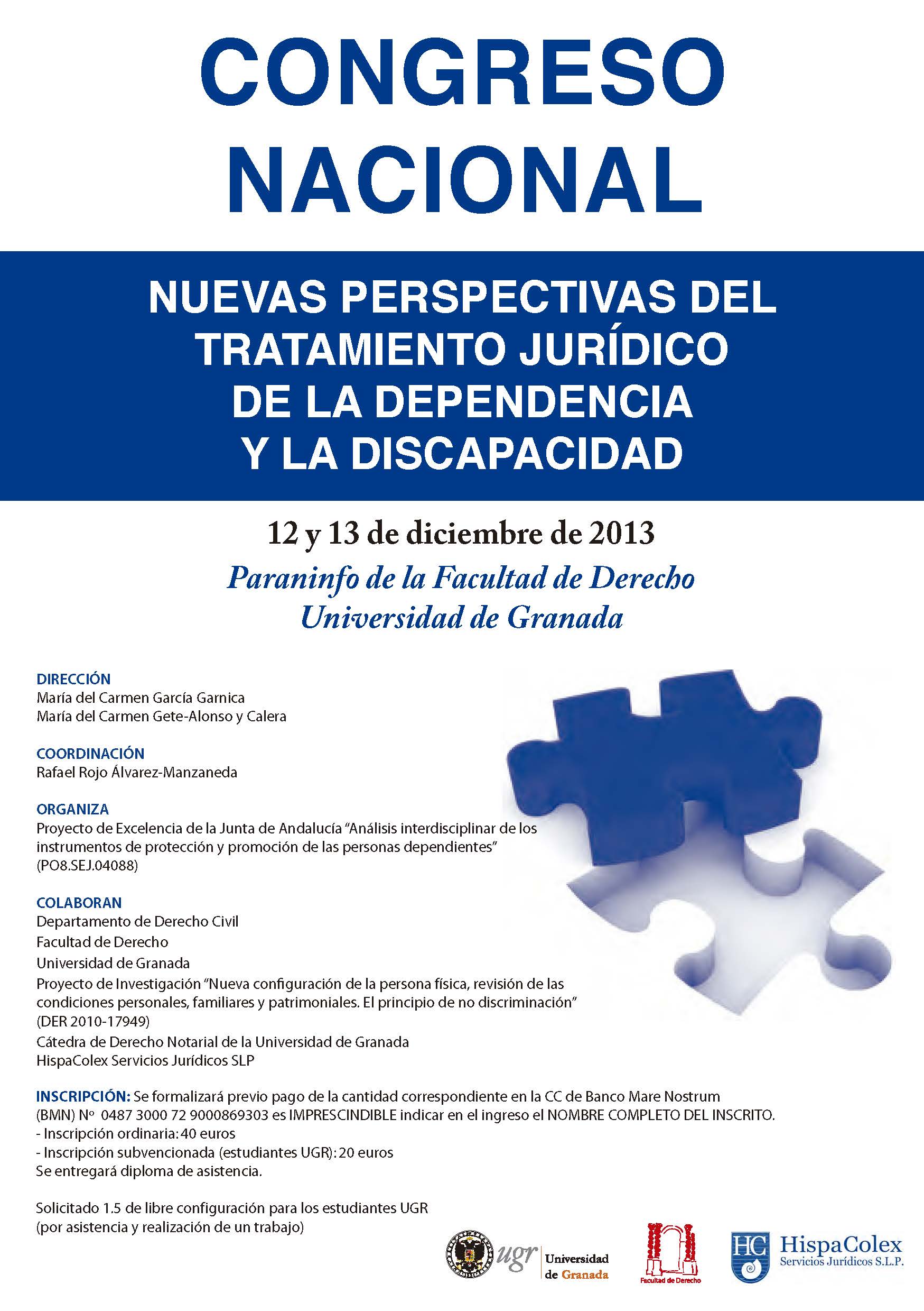Los días 12 y 13 de diciembre tendrá lugar el Congreso Nacional sobre Nuevas Perspectivas del Tratamiento Jurídico de la Dependencia y la Discapacidad organizado a través del Proyecto de excelencia de la Junta de Andalucía “Análisis interdisciplinar de los instrumentos de protección y promoción de las personas dependientes» y que se celebrará en el Paraninfo de la Facultad de Derecho de la Universidad de Granada.