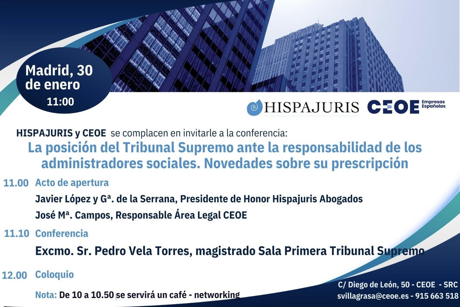 HISPACOLEX-HISPAJURIS junto con CEOE organizan la conferencia de VELA TORRES, Magistrado del Supremo, sobre la responsabilidad de los administradores sociales
