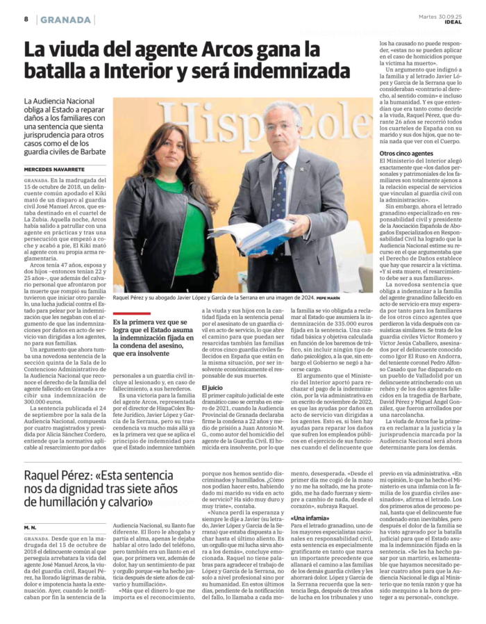 La Sala de lo Contencioso-Administrativo de la Audiencia Nacional (AN) ha dictado una sentencia «novedosísima» que condena al Ministerio del Interior a indemnizar con más de 334.200 euros a la familia del agente de la Guardia Civil José Manuel Arcos, asesinado en Huétor Vega (Granada) en 2018 y garantiza la indemnización para la viuda y sus dos hijos menores, cuya defensa ha estado a cargo del director de HispaColex, Javier López y García de la Serrana.