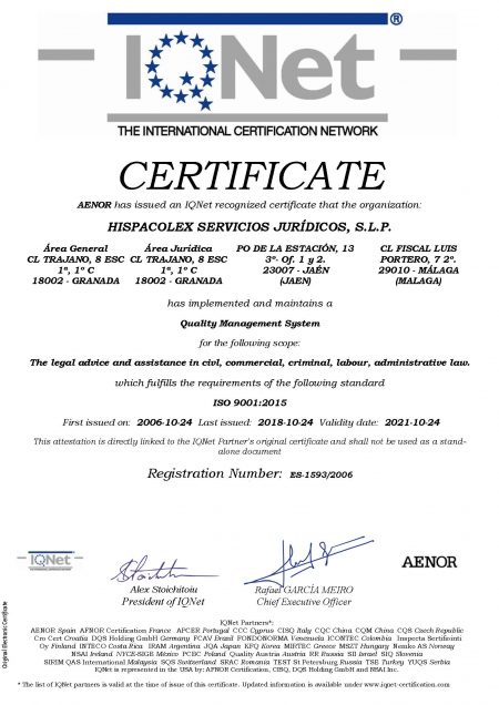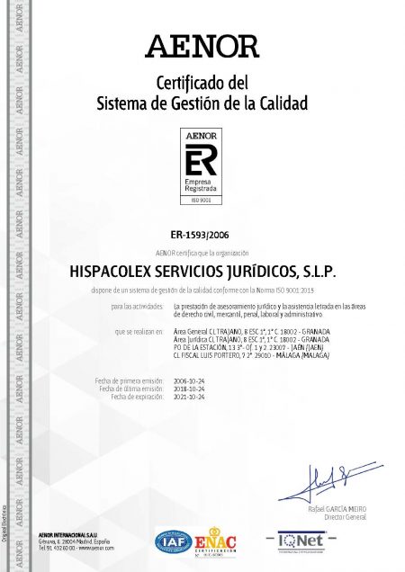 Esta es la décima renovación consecutiva de nuestro certificado por un nuevo período de tres años, lo que supone un reconocimiento por parte de AENOR, entidad líder de certificación en España, al Sistema de Gestión de la Calidad de HispaColex basado en altos estándares de exigencia implementados en la firma desde el año 2006, lo que la hizo merecedora de la categoría de empresa de servicios de asesoramiento jurídico más innovadora de las tres provincias donde tenemos sede (Granada, Málaga y Jaén).
