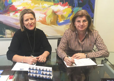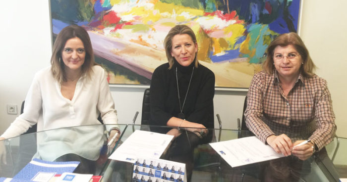 Por HispaColex, Cristina Ruiz, Directora de Empresas (izqda) y Carmen Moreno, Gerente (centro) con la representante y Relaciones Institucionales de INEAF, Pilar Plaza (drcha), tras la firma del Convenio de Colaboración.