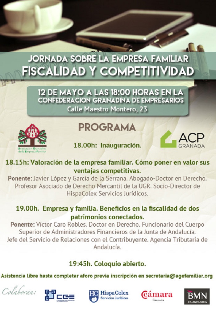 El objetivo de la misma es dar a conocer las ventajas competitivas de la empresa familiar y cómo ponerlas en valor, contando para ello con el director de HispaColex, Javier López García de la Serrana, doctor en derecho y profesor asociado de Derecho Mercantil de la UGR. Asimismo se analizará el régimen fiscal que les afecta, en especial los beneficios en la fiscalidad de dos patrimonios conectados, que será desarrollado por Víctor Caro Robles, Jefe del Servicio de Relaciones con el Contribuyente de la Agencia Tributaria Andaluza.