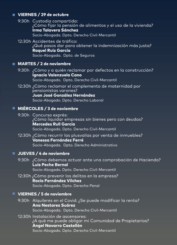 Como novedad, este año, «abrimos puertas y ventanas» para dar cabida a mayor número de participantes, quienes podrán elegir entre asistir presencialmente a las conferencias ofrecidas en nuestra sede de Granada (C/ Trajano, 8, 1ª Planta. 18002) o participar de forma online, para lo cual deberán solicitar el link de acceso a las sesiones de su interés a través del correo: puertasabiertas@hispacolex.com.