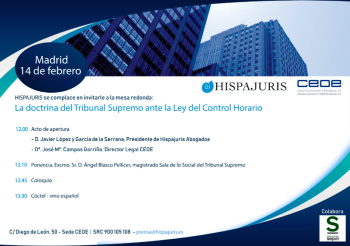 A este fin responde la Jornada que tendrá lugar el 14 de febrero en Madrid, organizada por Hispajuris Abogados, en colaboración con la CEOE, y que contará con la participación del magistrado de la Sala de los Social del Tribunal Supremo Excmo. Sr. Ángel Blasco Pellicer.