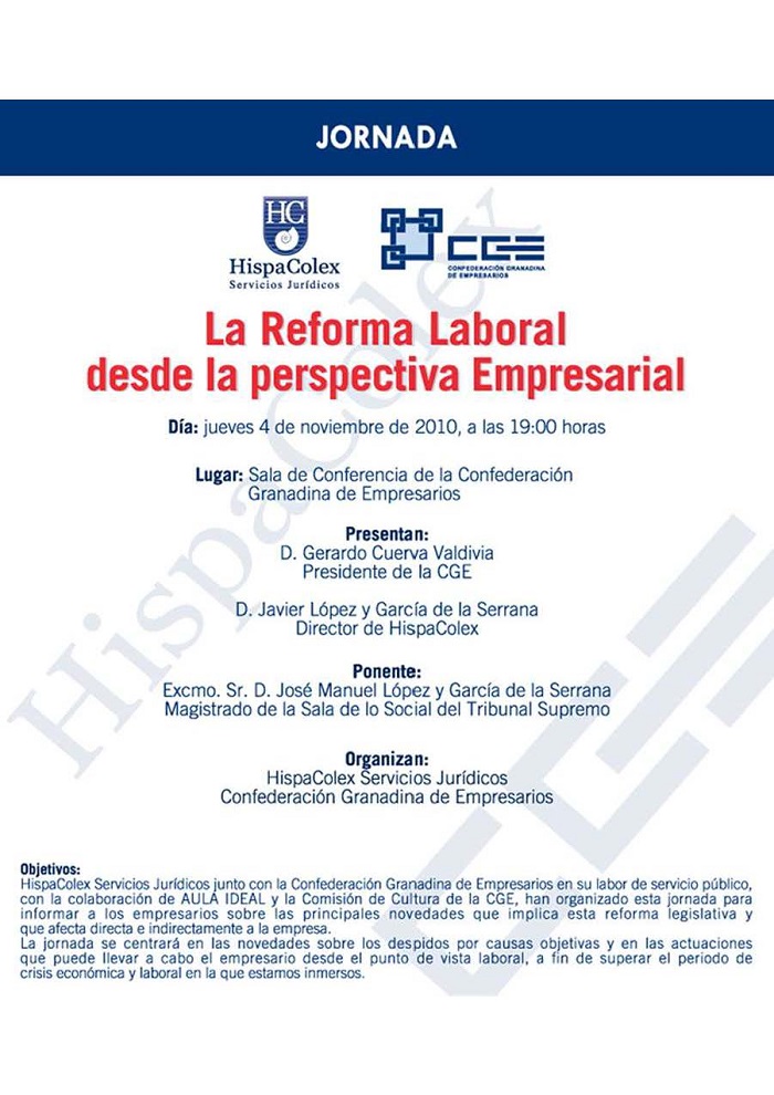 HispaColex Servicios Jurídicos junto con la Confederación Granadina de Empresarios en su labor de servicio público con la colaboración de AULA IDEAL y la Comisión de Cultura de la CGE, han organizado esta jornada para informar a los empresarios sobre las principales novedades que implica esta reforma legislativa y que afecta directa e indirectamente a la empresa. La jornada se centrará en las novedades sobre los despidos por causas objetivas y en las actuaciones que puede llevar a cabo el empresario desde el punto de vista laboral a fin de superar el periodo de crisis económica y laboral en la que estamos inmersos.