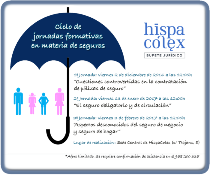 Desde HispaColex invitamos a mediadores y agentes de seguros de Granada que puedan estar interesados en asistir a las siguientes jornadas de este Ciclo a que realicen su reserva comunicándolo al correo info@hispacolex.com o llamando al teléfono 958 200 335.