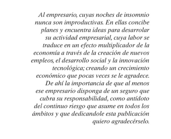 La obra presentada, “El seguro en la empresa”, constituye el VII Cuaderno de la Cátedra Fundación INADE y se trata de un estudio sobre las obligaciones de las partes contratantes del seguro, los seguros de daños y el seguro de responsabilidad civil en el ámbito empresarial. De ahí que su autor, Javier López y García de la Serrana, lo haya dedicado a los empresarios que tanto contribuyen a la economía de nuestro país, con una emotiva dedicatoria: