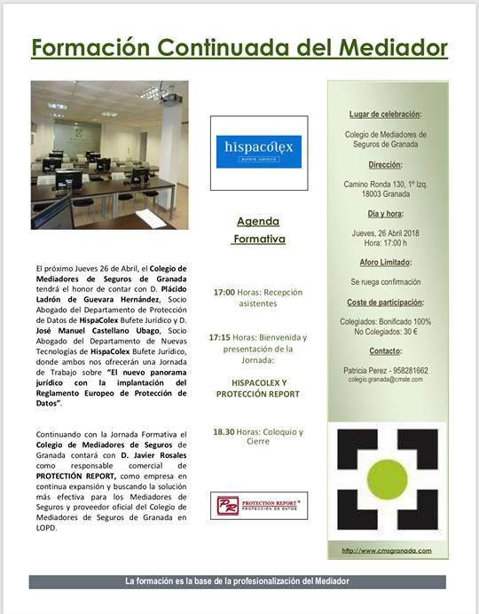 El próximo jueves 26 de abril, el Colegio de Mediadores de Seguros de Granada celebrará una Jornada de Trabajo sobre «El nuevo panorama Jurídico con la implantación del Reglamento Europeo de Protección de Datos» que contará con las intervenciones de Placido Ladrón de Guevara Hernández, Socio-Abogado del Departamento de Protección de Datos de HispaColex Bufete Jurídico y de José Manuel Castellano Ubago, Socio-Abogado del Departamento de Nuevas Tecnologías de HispaColex Bufete Jurídico.