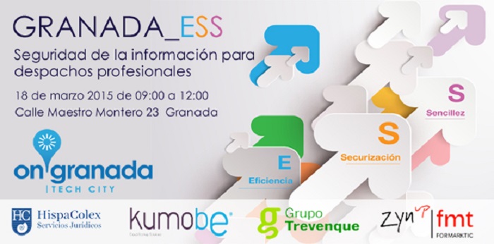 El día 18 de marzo en la sede de la CGE a las 09:00 horas se celebra una Jornada organizada por OnGranada Tech City, Kumobe y Formarktic y que cuenta con el apoyo de las empresas asociadas HispaColex Servicios Jurídicos y Grupo Trevenque sobre la seguridad de la información para despachos profesionales. En esta jornada podrás conocer en profundidad la LOPD en su relación con las nuevas tecnologías, así como adquirir conocimientos para su correcto cumplimiento. Se presentarán distintas soluciones para el tratamiento y seguridad de los datos y canales de comunicación seguros para el transporte de toda la información. Nuevas soluciones de copia de seguridad y compartición de datos, que cumplen con la LOPD.