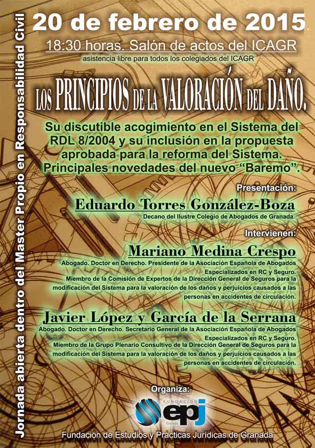 Tuvo lugar el pasado día 20/02/2015, desde las 18:30 hasta las 21:30 horas, en el salón de actos de la sede del Colegio de Abogados de Granada, que contó con un lleno absoluto de asistentes, lo que junto al alto nivel de las ponencias supuso un rotundo éxito. En la misma se abordó el discutible acogimiento de los Principios Institucionales del Derecho de Daños en el Sistema del RDL 8/2004 y su inclusión en la propuesta para la reforma del Sistema, así como las principales novedades del nuevo «Baremo» para valoración del daño corporal en accidentes de circulación, que será aprobado en breve por el Gobierno. Los ponentes explicaron sus apartados más importantes y novedosos, dando lugar tras su exposición a un amplio coloquio sobre un tema de sumo interés que va a cambiar de forma muy relevante las indemnizaciones en los accidentes de circulación.