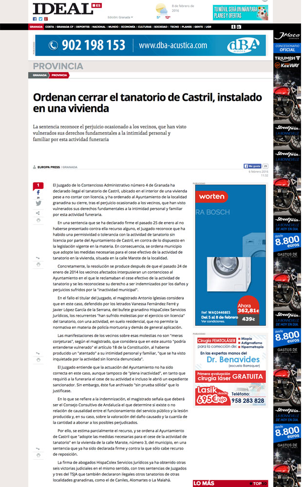 Los abogados de HispaColex logran una sentencia favorable para cerrar el tanatorio de Castril, instalado en una vivienda