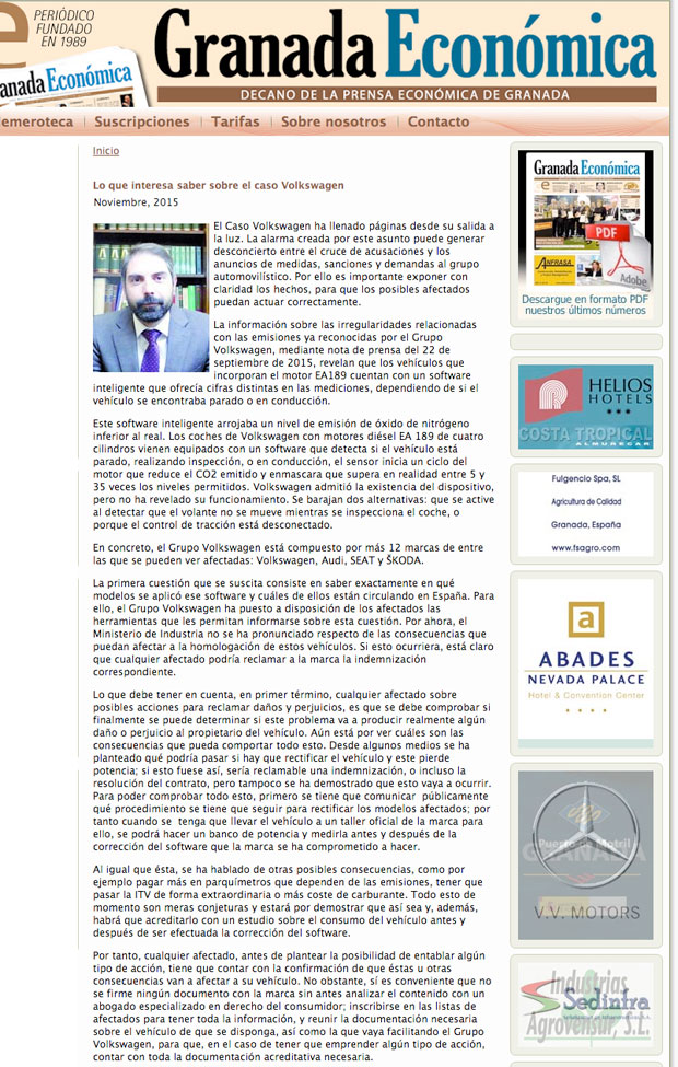 Artículo del socio-abogado de HispaColex, Plácido Ladrón de Guevara, sobre lo que interesa saber en el caso Volkswagen. (Granada Económica)