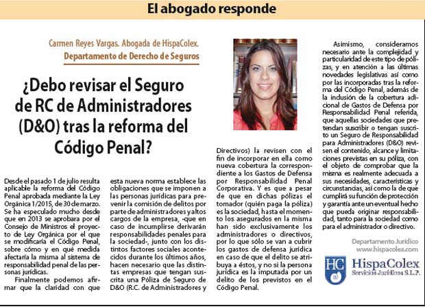 Artículo de Carmen Reyes, abogada de HispaColex, titulado “¿Debo revisar el Seguro de RC de Administradores (D&O) tras la reforma del Código Penal?” (Granada Económica)