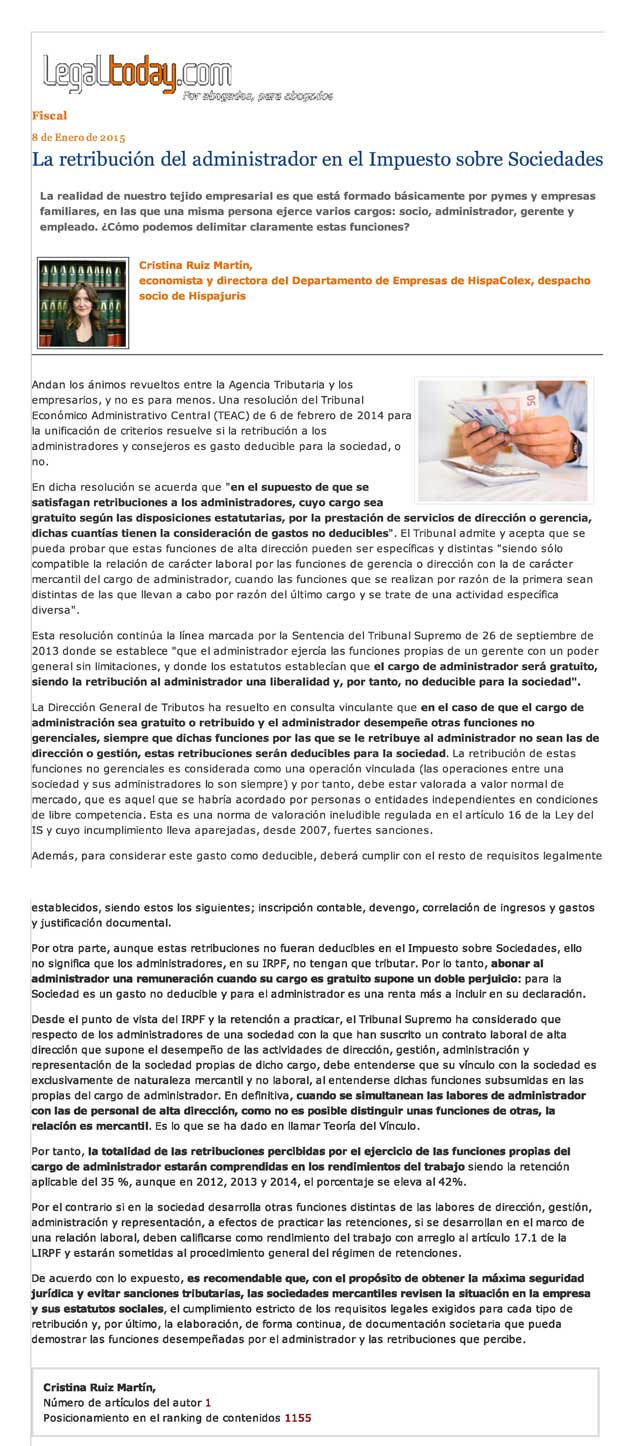 Artículo de Cristina Ruiz Martín, economista en HispaColex, titulado «La retribución del administrador en el impuesto de sociedades» (LegalToday.com)