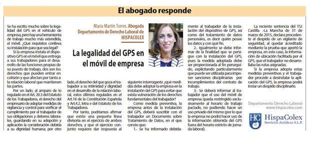 Artículo de la abogada de HispaColex, María Martín, sobre la legalidad del GPS en el móvil de la empresa (Granada Económica)