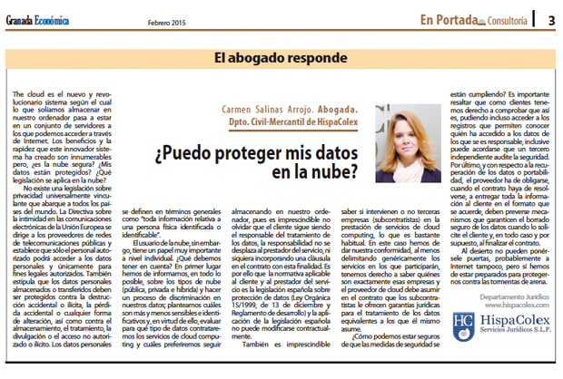 Artículo de nuestra abogada Carmen Salinas titulado: ¿Puedo proteger mis datos en la nube? (Granada Económica)