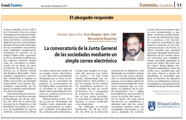 20/01/2015 Artículo del abogado y socio de HispaColex, Sebastián Sigüenza Bey, sobre «La convocatoria de la junta general de las sociedades mediante un simple correo electrónico» (Granada Económica) Fuente: Artículo del abogado y socio de HispaColex, Sebastián Sigüenza Bey, sobre "La convocatoria de la junta general de las sociedades mediante un simple correo electrónico" (Granada Económica). PDF  Hispacolex < AnteriorSiguiente > Deja una respuesta Cancelar la respuestaTu dirección de correo electrónico no será publicada. Los campos obligatorios están marcados con *Comentario * Nombre * Correo electrónico * Web Guarda mi nombre, correo electrónico y web en este navegador para la próxima vez que comente. Δ