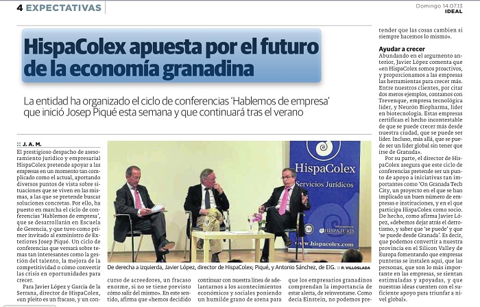 15/07/2013 DIARIO IDEAL / JULIO 2013 HispaColex apuesta por el futuro de la economía granadina. La entidad ha organizado el ciclo de conferencias «Hablemos de Empresa» que inició Josep Piqué esta semana y que continuará en septiembre. Fuente:  Hispacolex < AnteriorSiguiente > Deja una respuesta Cancelar la respuestaTu dirección de correo electrónico no será publicada. Los campos obligatorios están marcados con *Comentario * Nombre * Correo electrónico * Web Guarda mi nombre, correo electrónico y web en este navegador para la próxima vez que comente. Δ