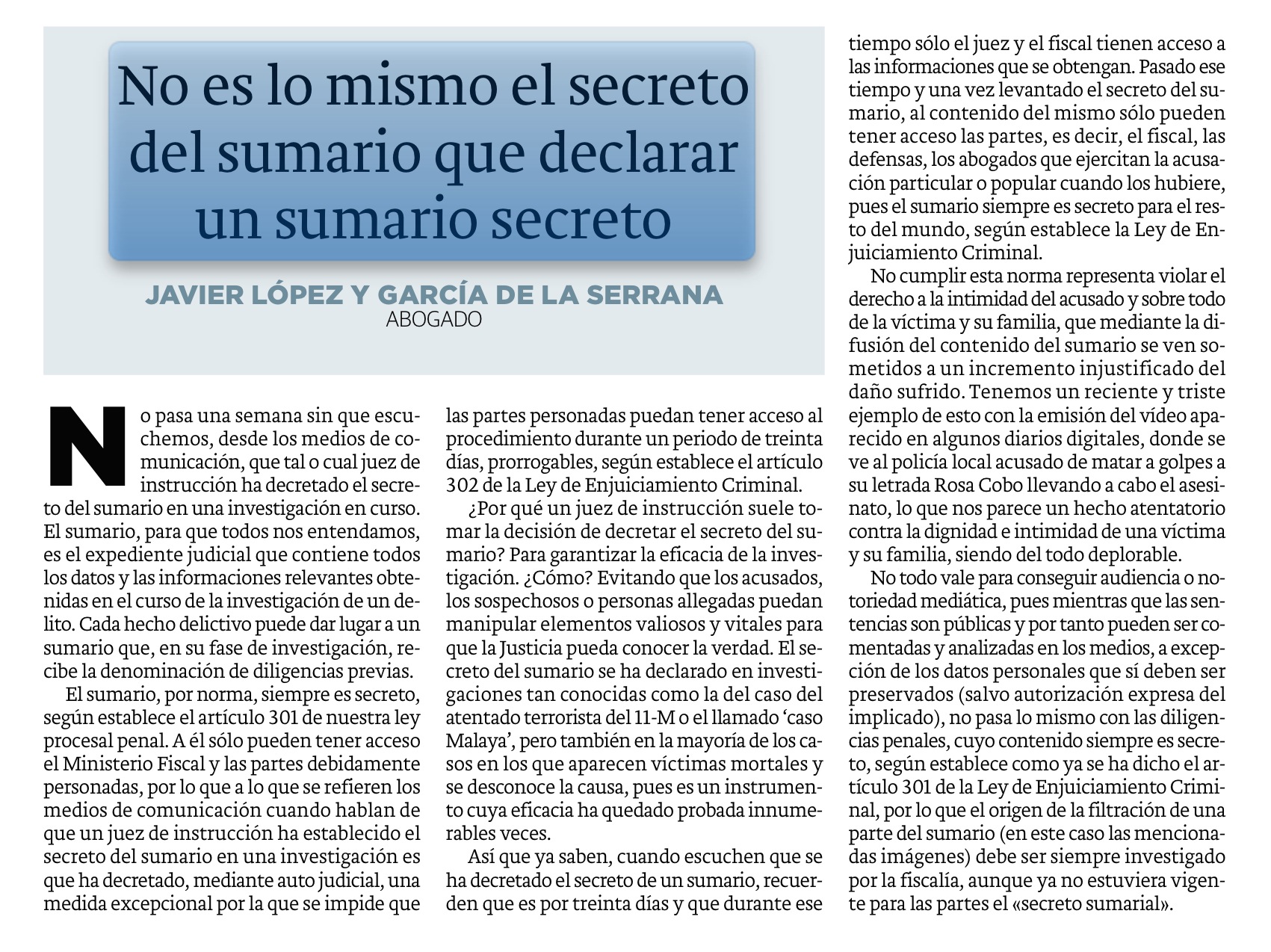 No es lo mismo secreto de sumario, que declarar un sumario secreto. No pasa ni una semana sin que oigamos en las medios que tal o cual juez de instrucción ha decretado el secreto de sumario de una investigación en curso. El sumario, para que todos nos entendamos, es el expediente judicial que contiene todos los datos y las informaciones relevantes obtenidas en el curso de la investigación de un delito.