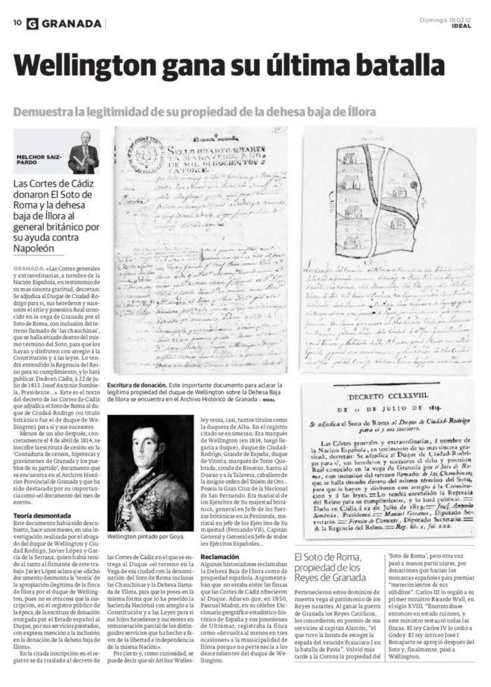 Demostrada la legitimidad de la propiedad del Duque de Wellington sobre la dehesa baja de Íllora, en una investigación realizada por el abogado del Duque, Javier López y García de la Serrana, el cual ha desmontado la ‘teoría’ de la apropiación ilegítima de la finca de Íllora por el Duque de Wellington, dado que en la donación que las Cortes de Cádiz le realizaron por su ayuda contra Napoleón se incluía dicha finca.