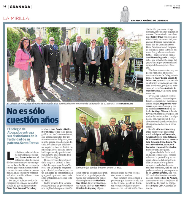 El Colegio de Abogados de Granada distingue a Javier López y García de la Serrana, director de HispaColex, como Colegiado de Honor en la festividad de su patrona Santa Teresa