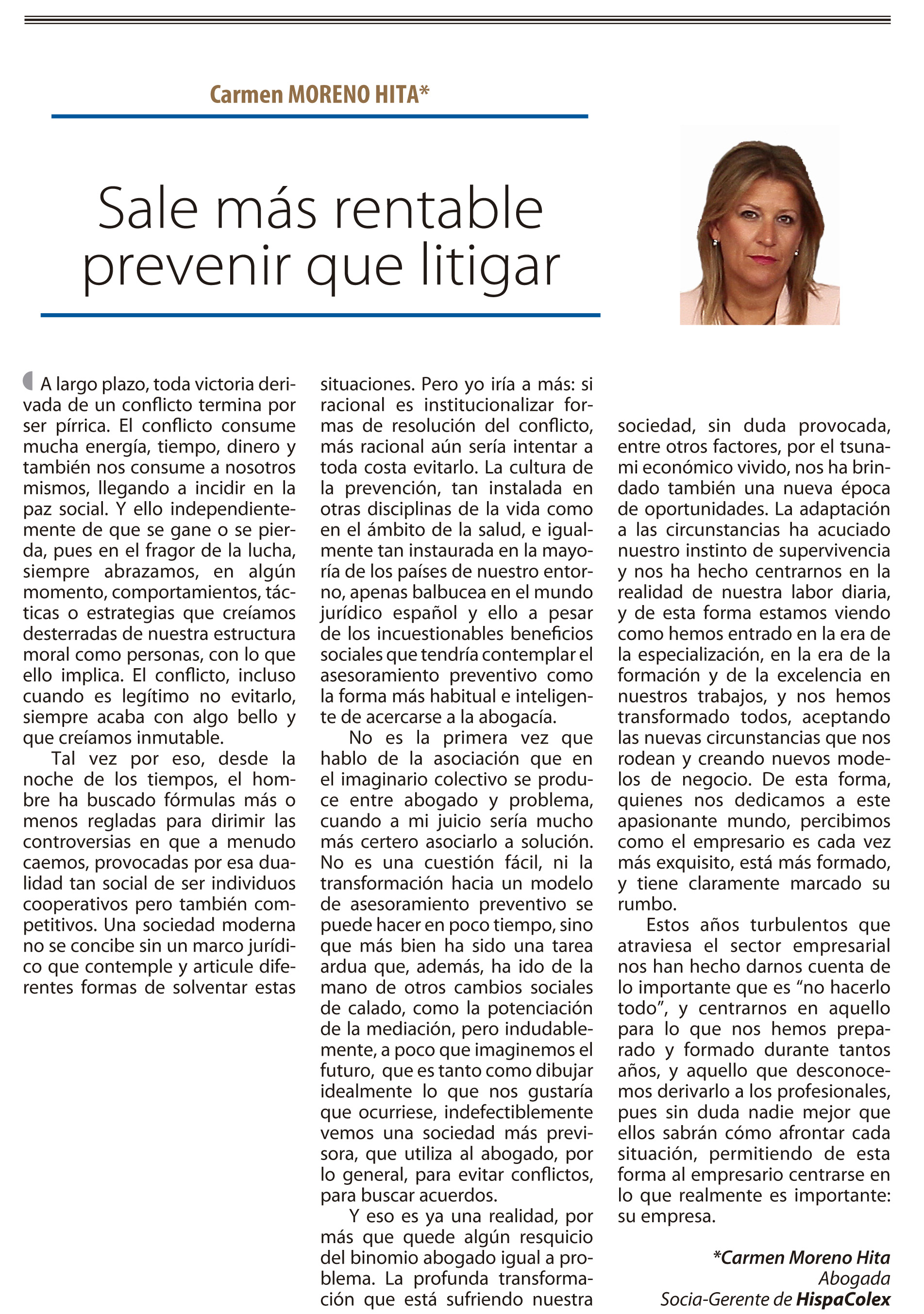 28/03/2014 GRANADA ECONÓMICA / MARZO 2014 «Sale más rentable prevenir que litigar» Artículo publicado en Granada Económica, en marzo de 2014, por Carmen Moreno Hita, abogada, socio-gerente de HispaColex. Fuente:  Hispacolex < AnteriorSiguiente > Deja una respuesta Cancelar la respuestaTu dirección de correo electrónico no será publicada. Los campos obligatorios están marcados con *Comentario * Nombre * Correo electrónico * Web Guarda mi nombre, correo electrónico y web en este navegador para la próxima vez que comente. Δ