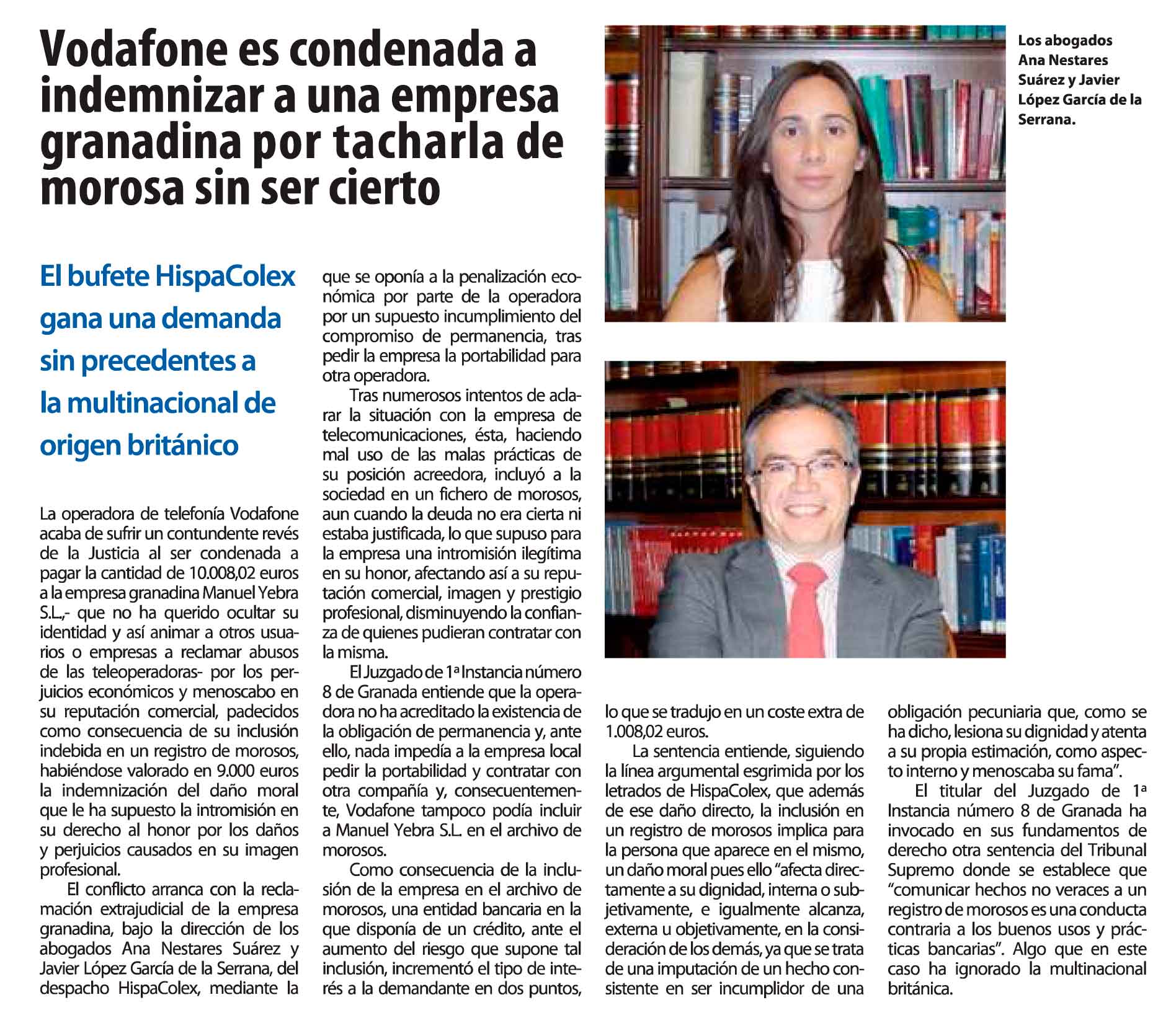 Vodafone es condenada a 10.000 euros de indemnización a una empresa granadina. La demanda presentada bajo la dirección de Ana Nestares Suárez y Javier López García de la Serrana, socios de HispaColex, supone un importante logro dado que reconoce un daño moral a una empresa por su inclusión en un listado de morosos.