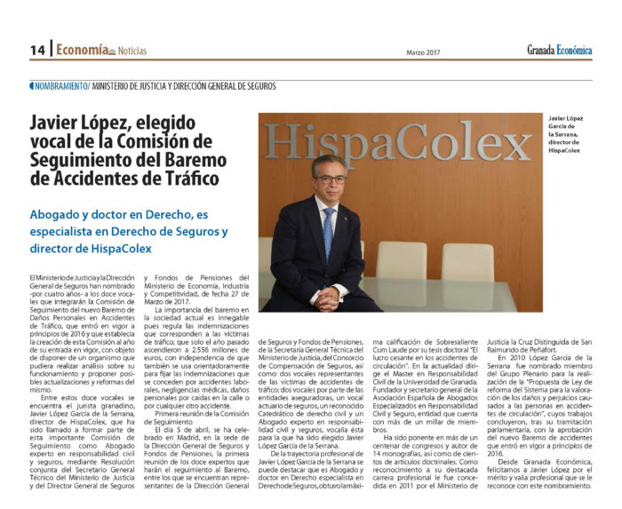 12/04/2017 Granada Económica: Noticia del nombramiento de Javier López García de la Serrana como vocal de la Comisión de Seguimiento del Baremo de accidentes de tráfico. Acceso al contenido completo del articulo.  Abogados en Granada, Málaga y Jaén < AnteriorSiguiente > Deja una respuesta Cancelar la respuestaTu dirección de correo electrónico no será publicada. Los campos obligatorios están marcados con *Comentario * Nombre * Correo electrónico * Web Guarda mi nombre, correo electrónico y web en este navegador para la próxima vez que comente. Δ