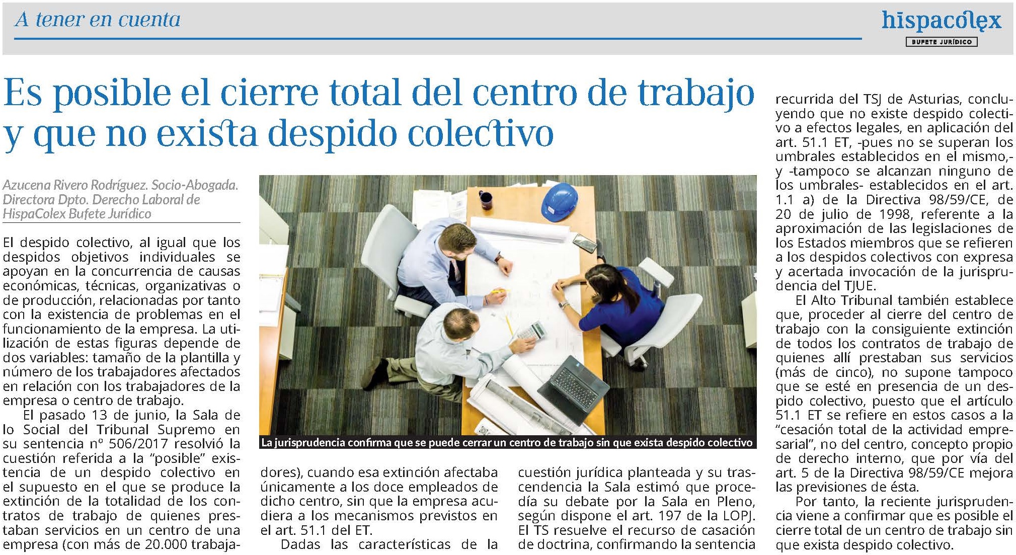 El pasado 13 de junio, la Sala de lo Social del Tribunal Supremo en su sentencia nº 506/2017 resolvió la cuestión referida a la “posible” existencia de un despido colectivo en el supuesto en el que se produce la extinción de la totalidad de los contratos de trabajo de quienes prestaban servicios en un centro de una empresa (con más de 20.000 trabajadores), cuando esa extinción afectaba únicamente a los doce empleados de dicho centro, sin que la empresa acudiera a los mecanismos previstos en el art. 51.1 del ET.