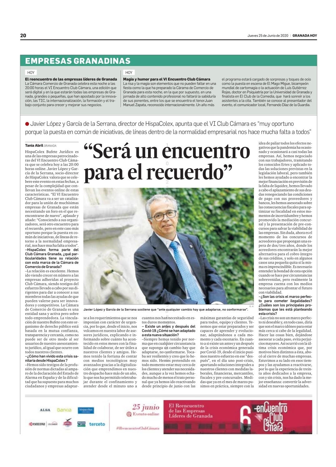 25/06/2020 GRANADA HOY: HispaColex patrocina el 6º Encuentro Club Cámara Entrevista a Javier López y García de la Serrana  Abogados en Granada, Málaga y Jaén < AnteriorSiguiente > Deja una respuesta Cancelar la respuestaTu dirección de correo electrónico no será publicada. Los campos obligatorios están marcados con *Comentario * Nombre * Correo electrónico * Web Guarda mi nombre, correo electrónico y web en este navegador para la próxima vez que comente. Δ