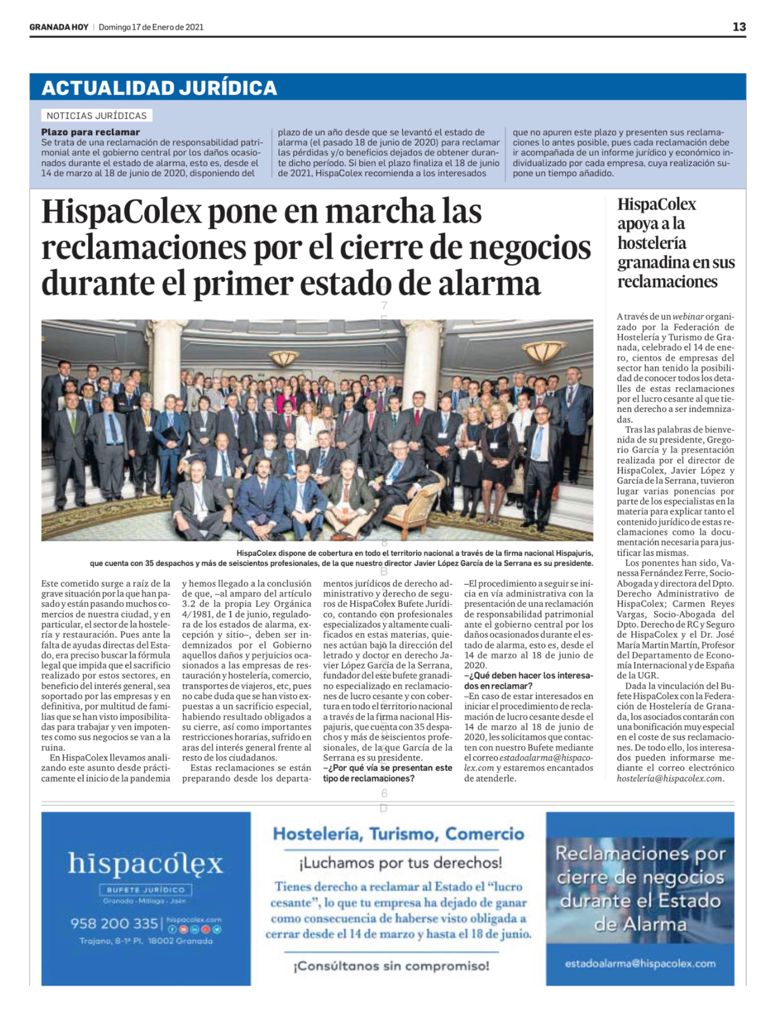 17/01/2021 Granada Hoy: HispaColex pone en marcha las reclamaciones por el cierre de negocios durante el primer Estado de Alarma  Abogados en Granada, Málaga y Jaén < AnteriorSiguiente > Los comentarios están cerrados.